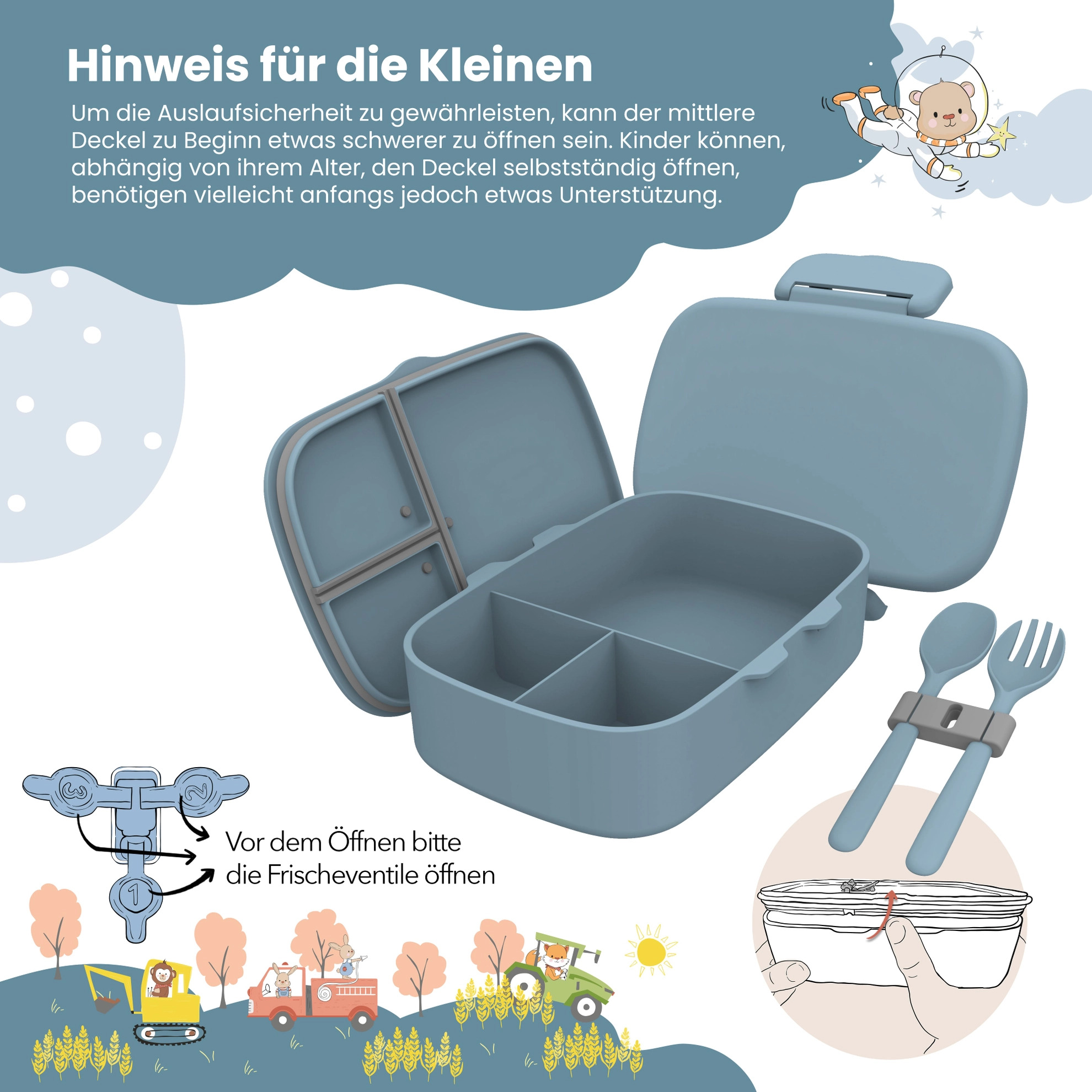 Madkassen er udstyret med et nemt lukningssystem, der sørger for, at alt indhold forbliver sikkert – selv når den hvirvler rundt i skoletasken eller rygsækken. Derudover er madkassen (uden bestik og låg) mikrobølgesikker, hvilket gør det nemt at opvarme maden direkte.