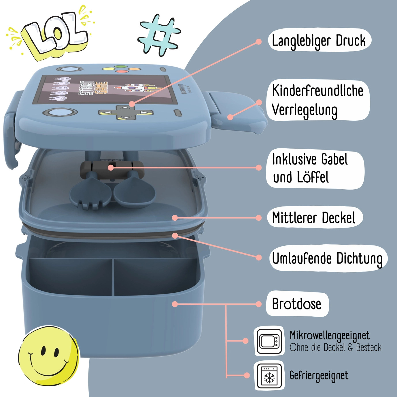 Madkassen er udstyret med et nemt lukningssystem, der sørger for, at alt indhold forbliver sikkert – selv når den hvirvler rundt i skoletasken eller rygsækken. Derudover er madkassen (uden bestik og låg) mikrobølgesikker, hvilket gør det nemt at opvarme maden direkte.