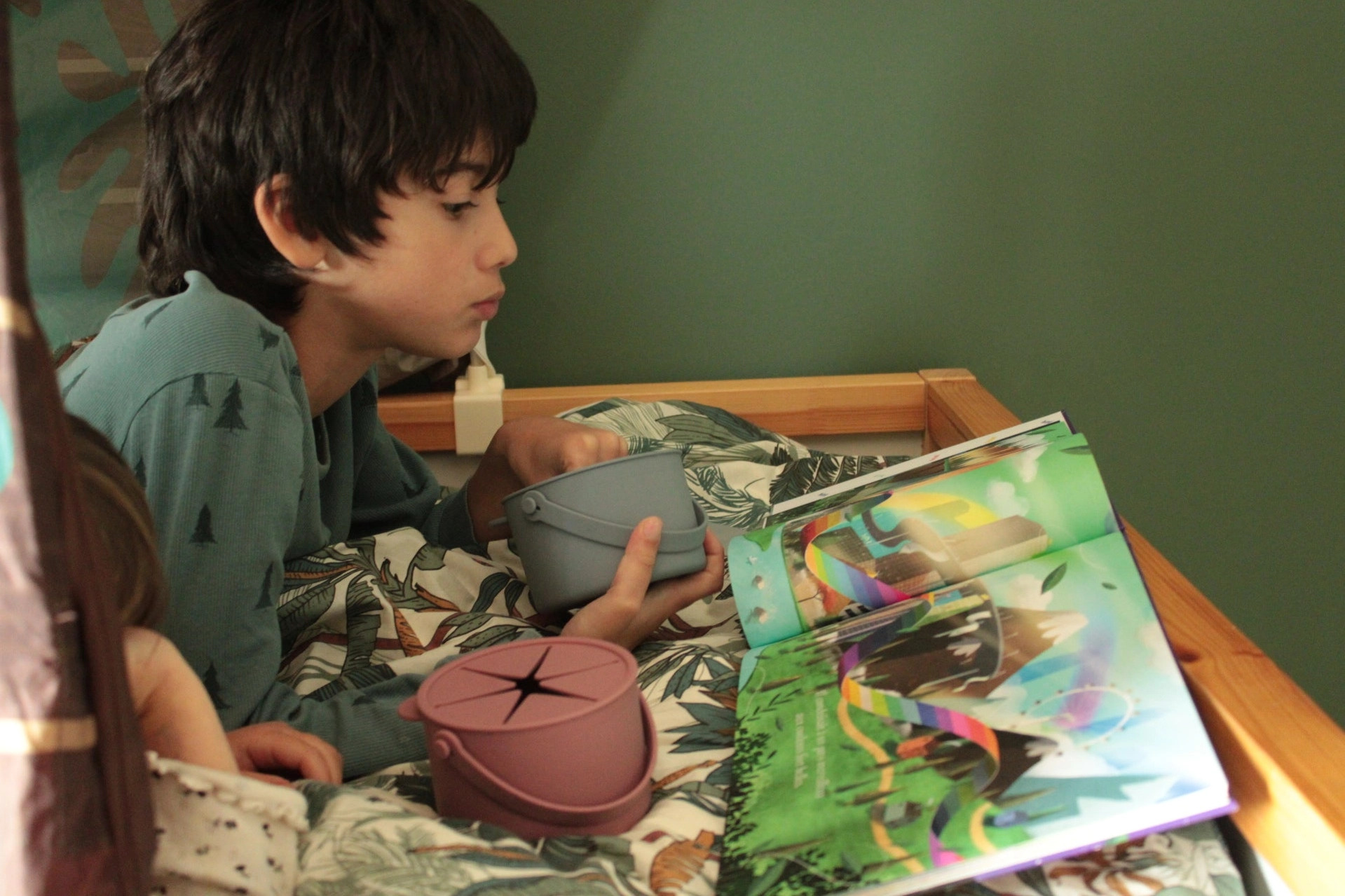 Snackkoppen er spildesikker, da den bløde åbning i låget sikre at barnets hænder let kan glide ind og ud, men at mad og snacks holdes inde.
