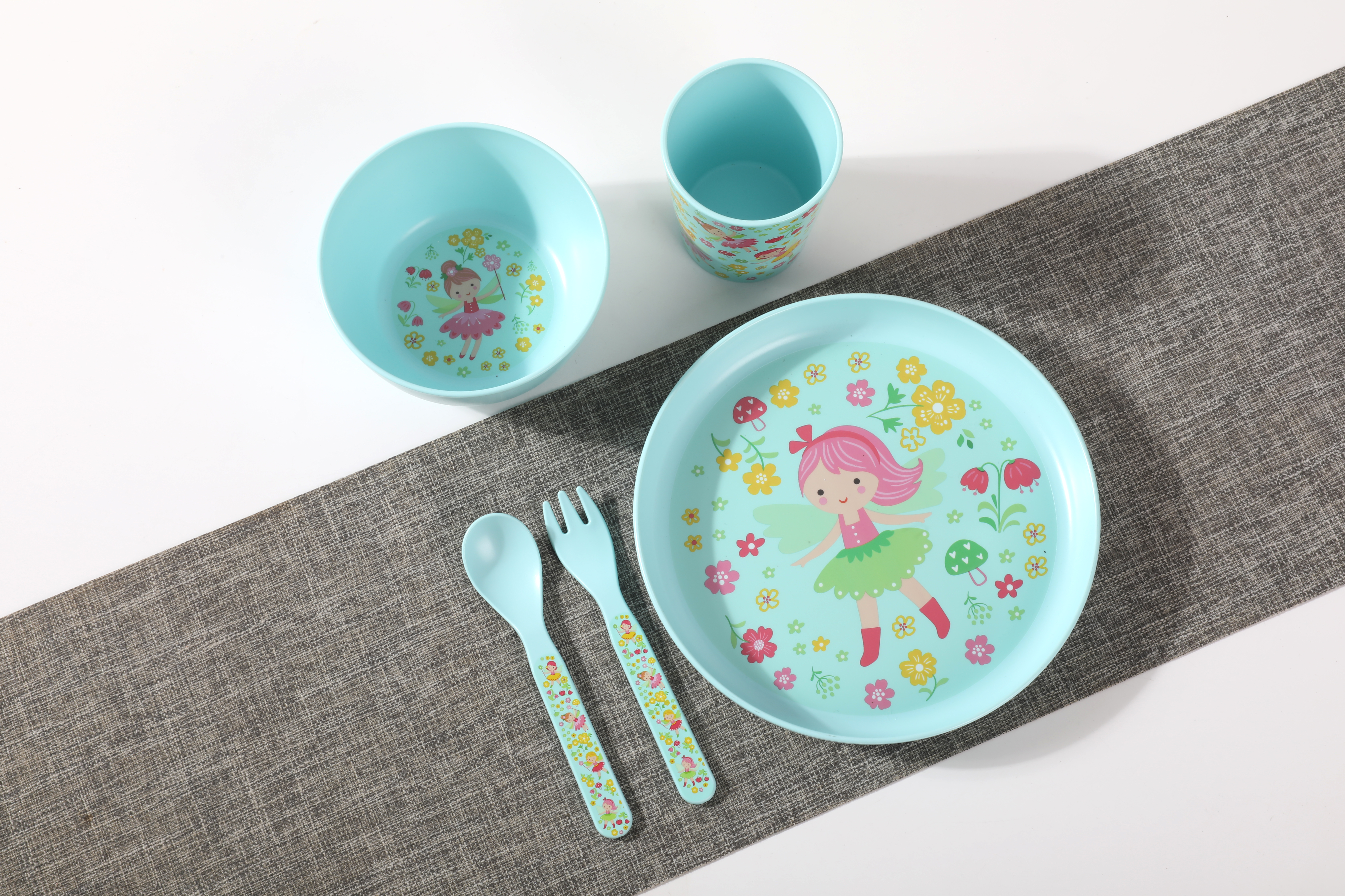 Servicesættet indeholder de dele, barnet har brug for til hverdagens måltider og er fremstillet i holdbart og fødevaregodkendt materiale, som egner sig til daglig brug. Delene er lette at håndtere for små hænder og nemme at rengøre efter brug.