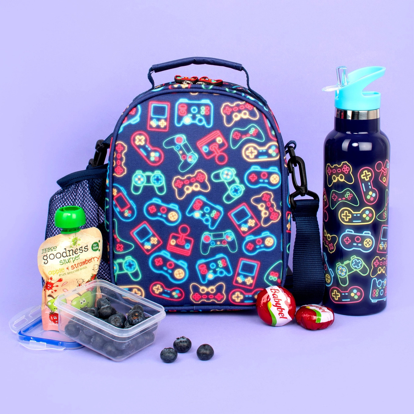 Design: Køletasken har et sejt neonfarvet gamer-design med spillekonsoller og kontroller, der appellerer til både børn og unge.