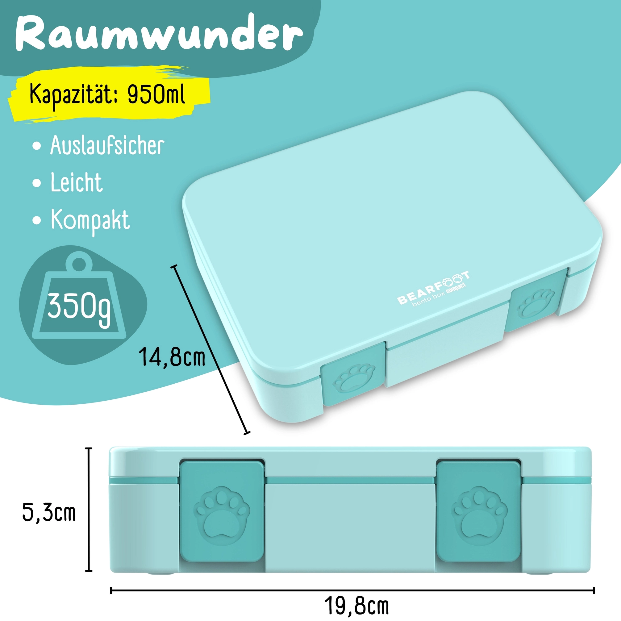 Gør madpakken til dagens højdepunkt med Bearfoot Bento Box COMPACT i den smukke turkise farve. Denne madkasse er skabt til hverdagen – fra børnehaven og skolens lange dage til udflugter i det fri. Med sit moderne design og børnevenlige funktioner forener den praktisk brug med et legende udtryk, som børn elsker.