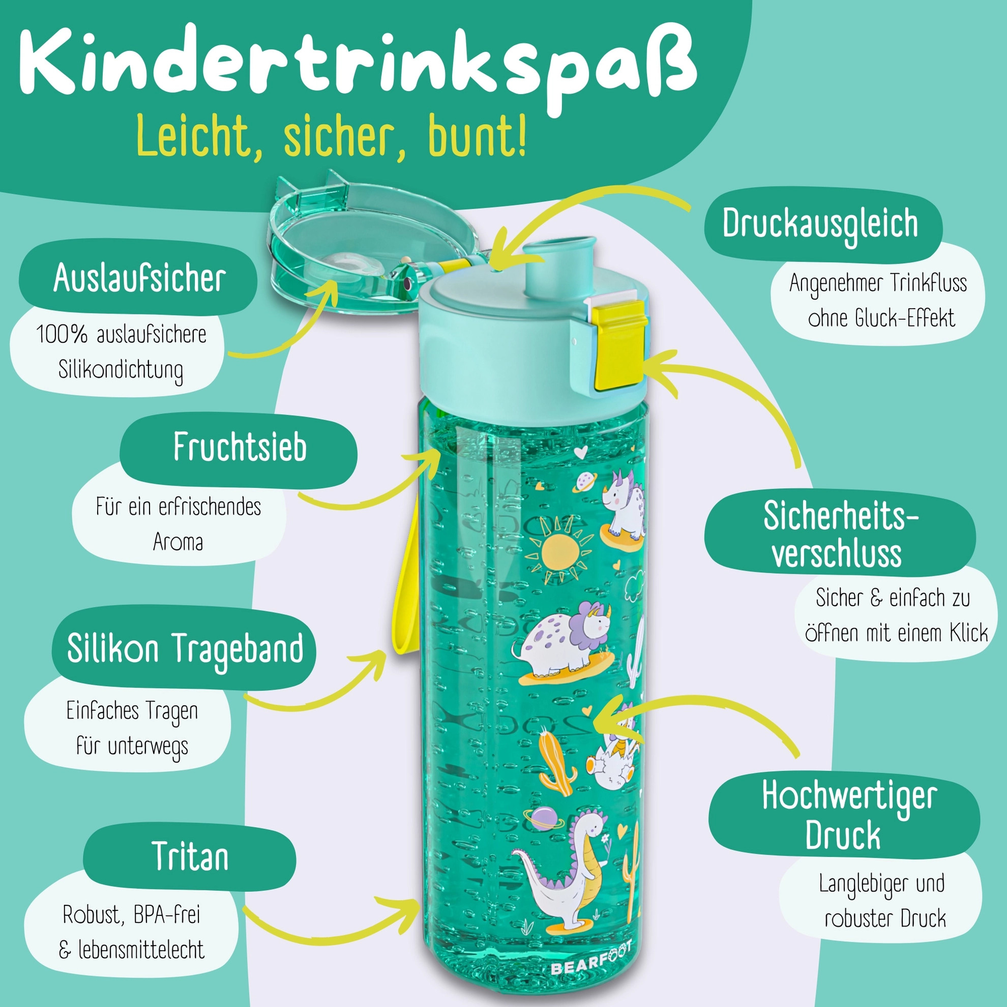 Gør hverdagen lidt sjovere med denne letvægts drikkedunk fra Bearfoot! Med et charmerende motiv af dinoer på en frisk blå baggrund er denne drikkedunk både praktisk og legende. Den rummer 500 ml og er perfekt til både skole, udflugter og sport.