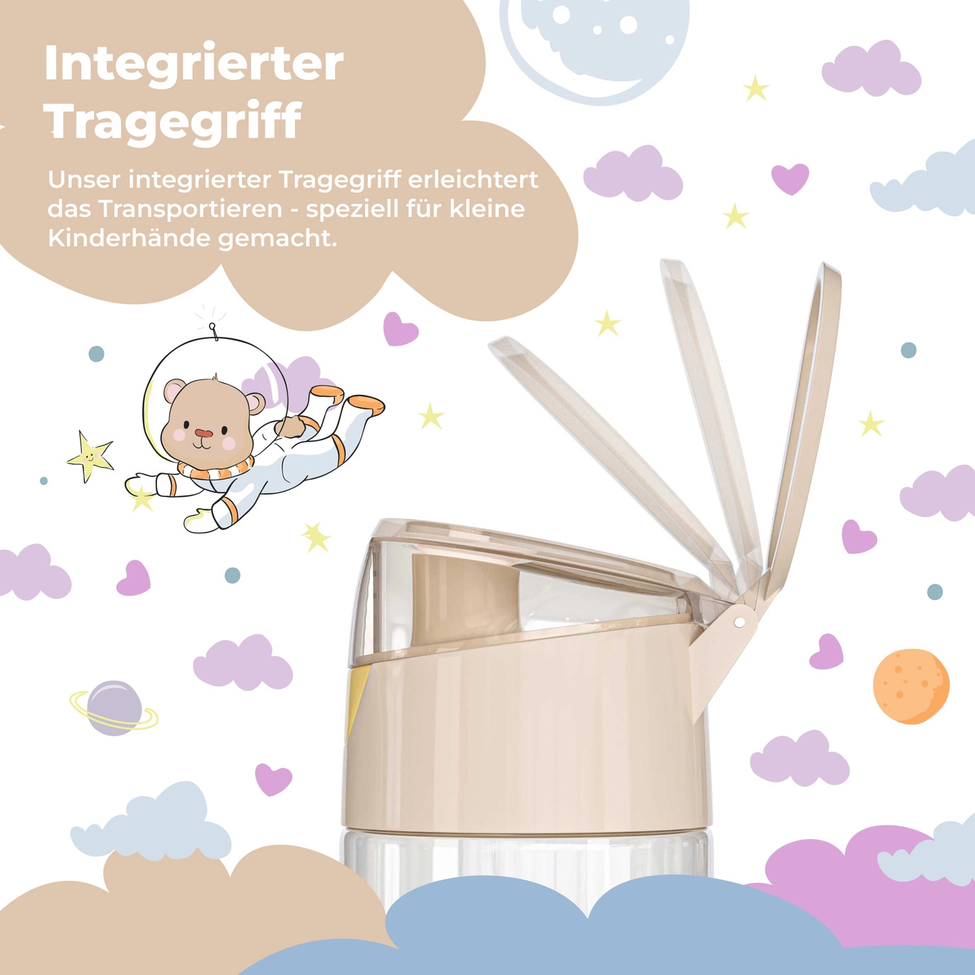 - Letvægtsdesign: Den lette konstruktion gør det nemt for børn at bære drikkedunken, uanset hvor de tager den med.