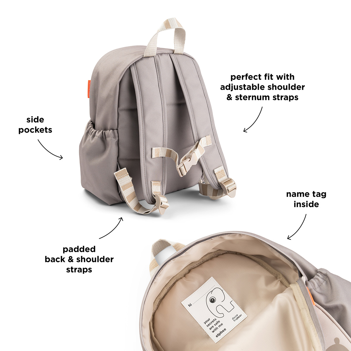 Design: Rygsækken har et sandfarvet design med et sødt motiv af Birdee, Elphee og Lalee, der gør den både sjov og iøjnefaldende.