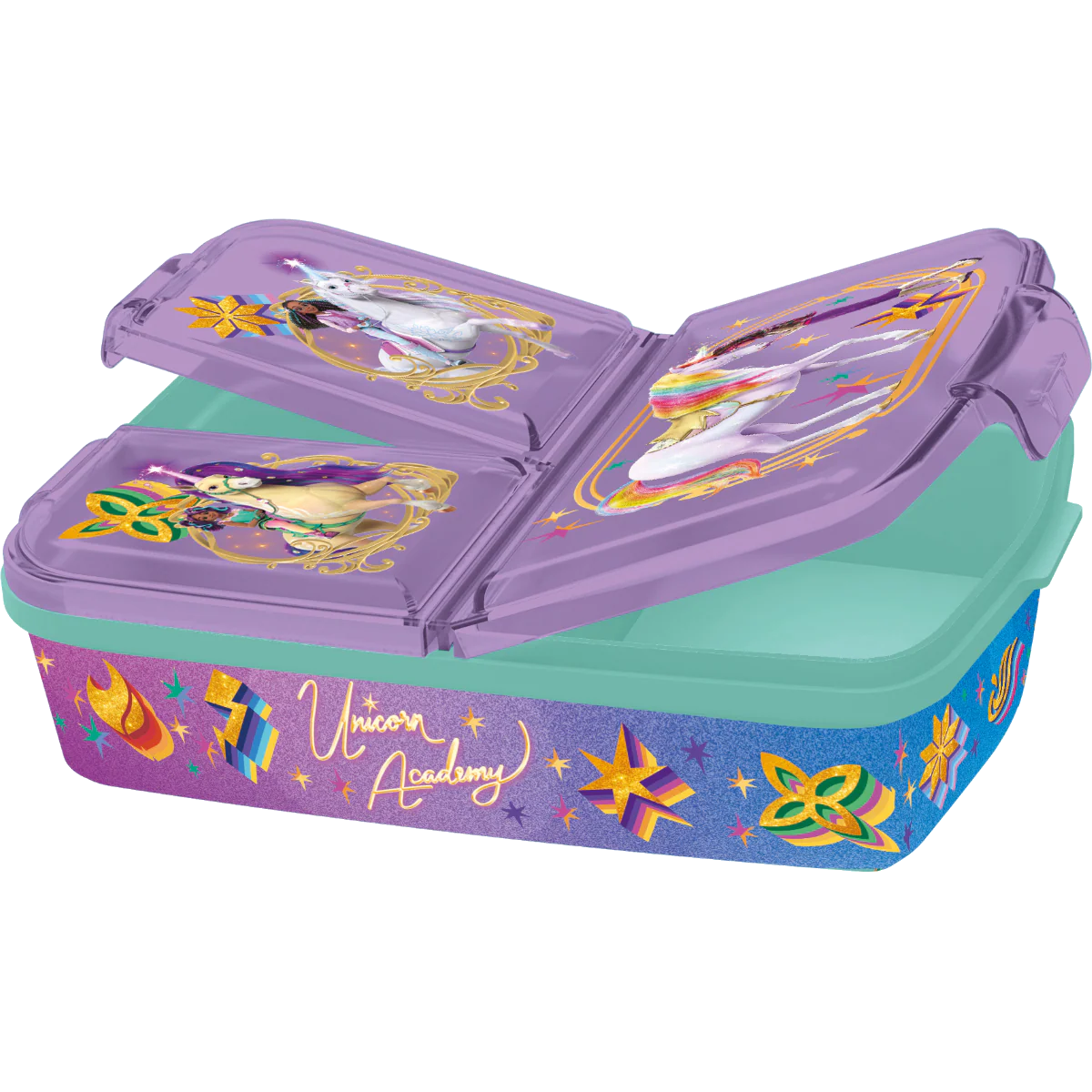Gør madpakken magisk med denne Unicorn Academy multirums madkasse – perfekt til skole, ture og hverdagsanretninger. Madkassen kommer med flere rum, så du kan holde forskellige dele af måltidet adskilt uden at smagene blandes.