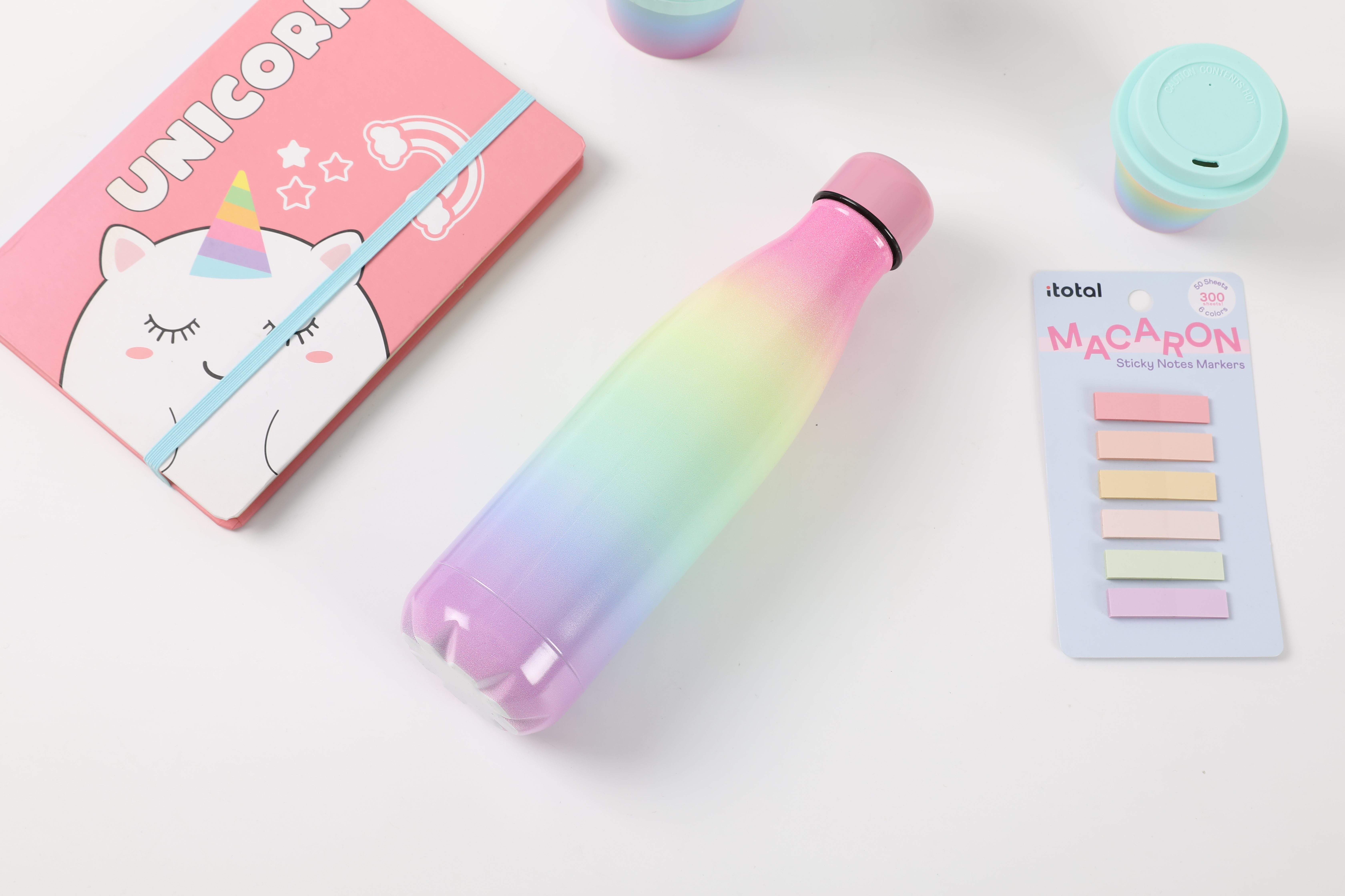Det bløde, pastel-“macaron” design kombineret med den slanke form gør flasken både funktionel og æstetisk — perfekt til skole, arbejde eller på farten.