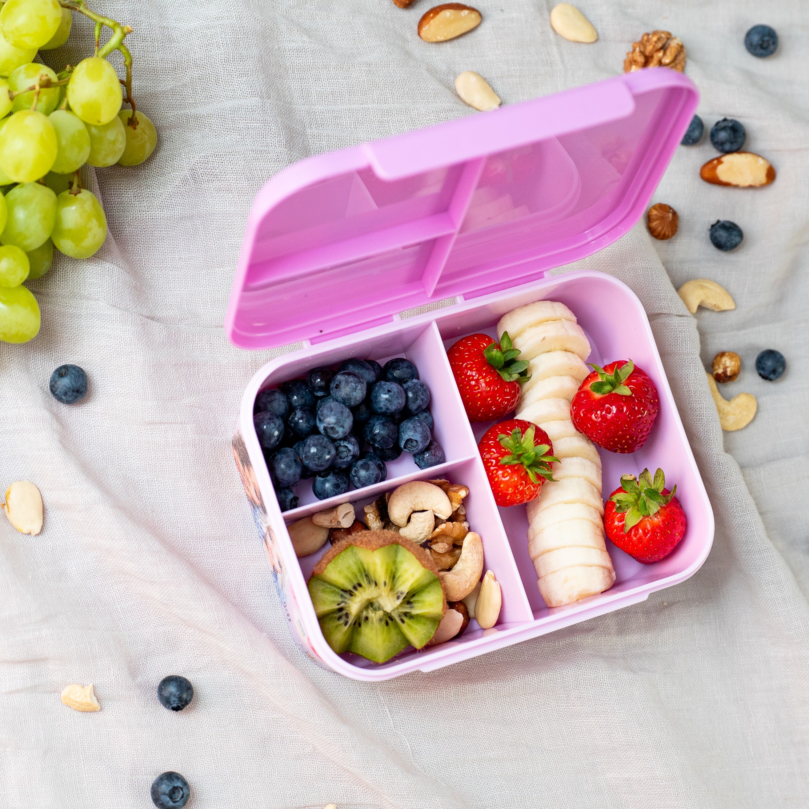 Fire separate rum: tre mindre øverst og et stort i bunden – ideel til sandwich, salat, snacks eller frugt.