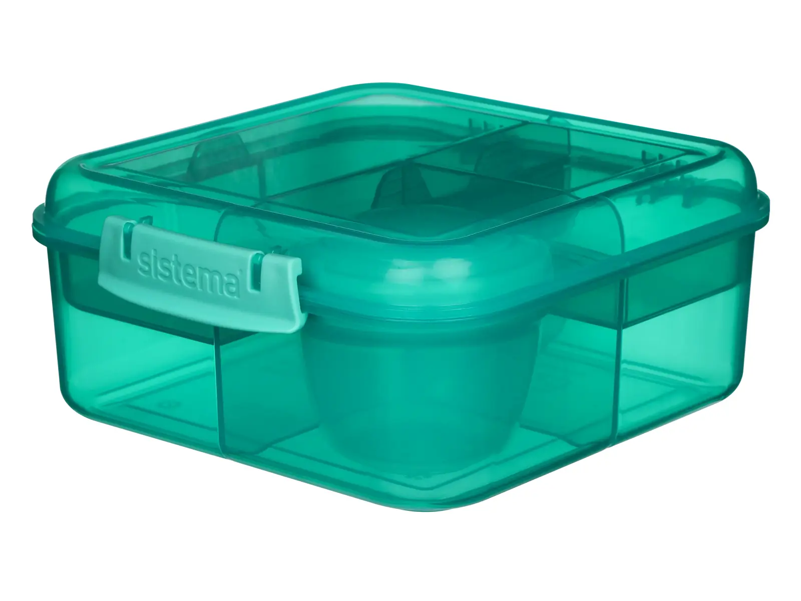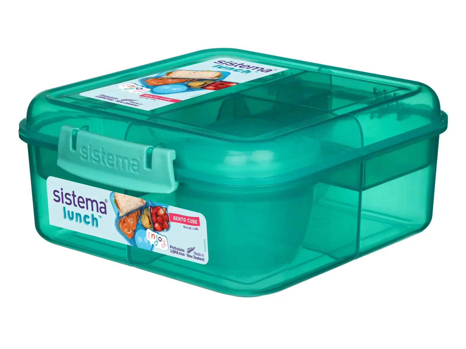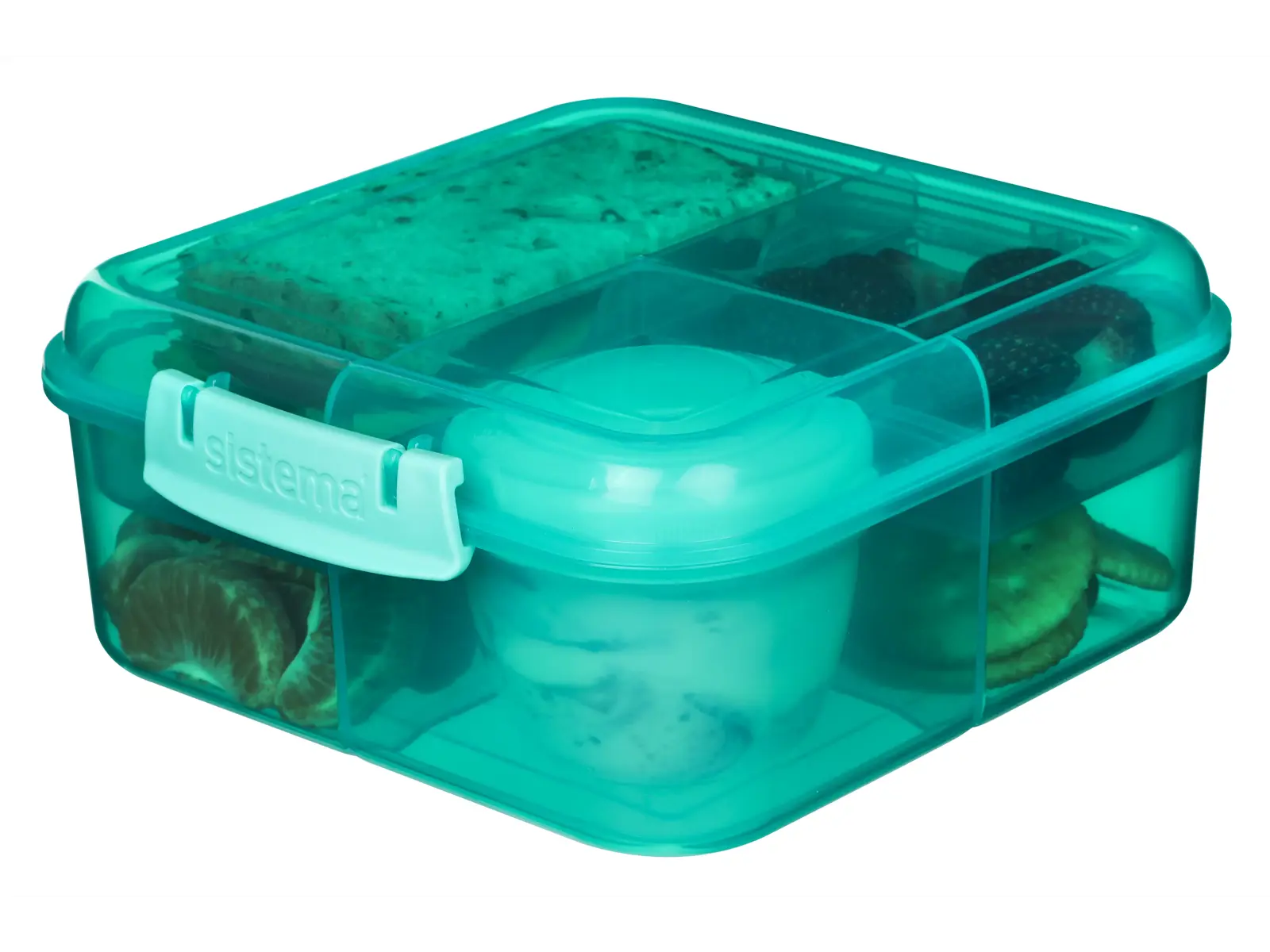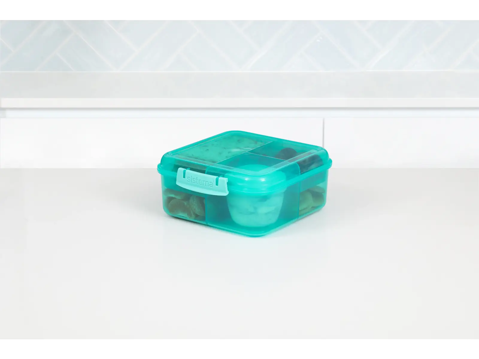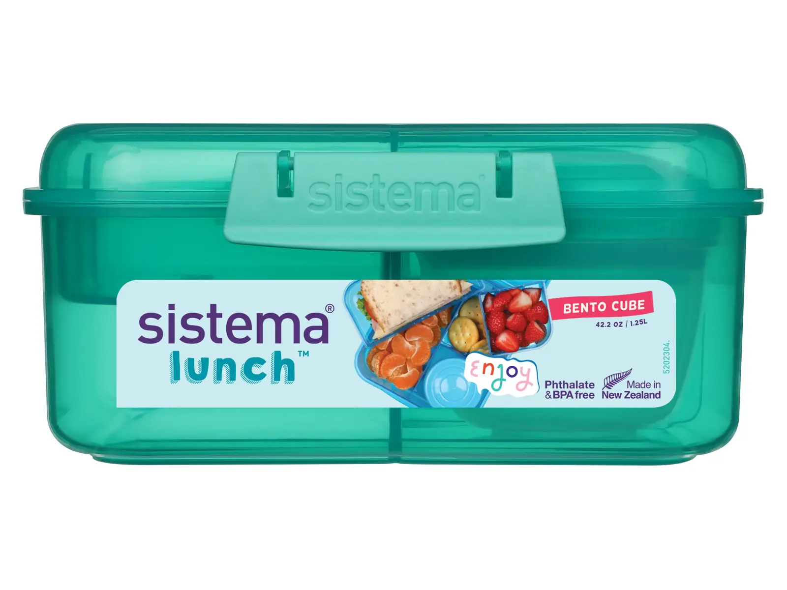 Låget er fastgjort med solide hængsler og lukkes sikkert med Sistema’s ikoniske clips – nemt for små hænder at åbne og lukke. Bento Cube passer perfekt i skoletasken og er lavet i sikre, BPA- og phthalatfrie materialer.