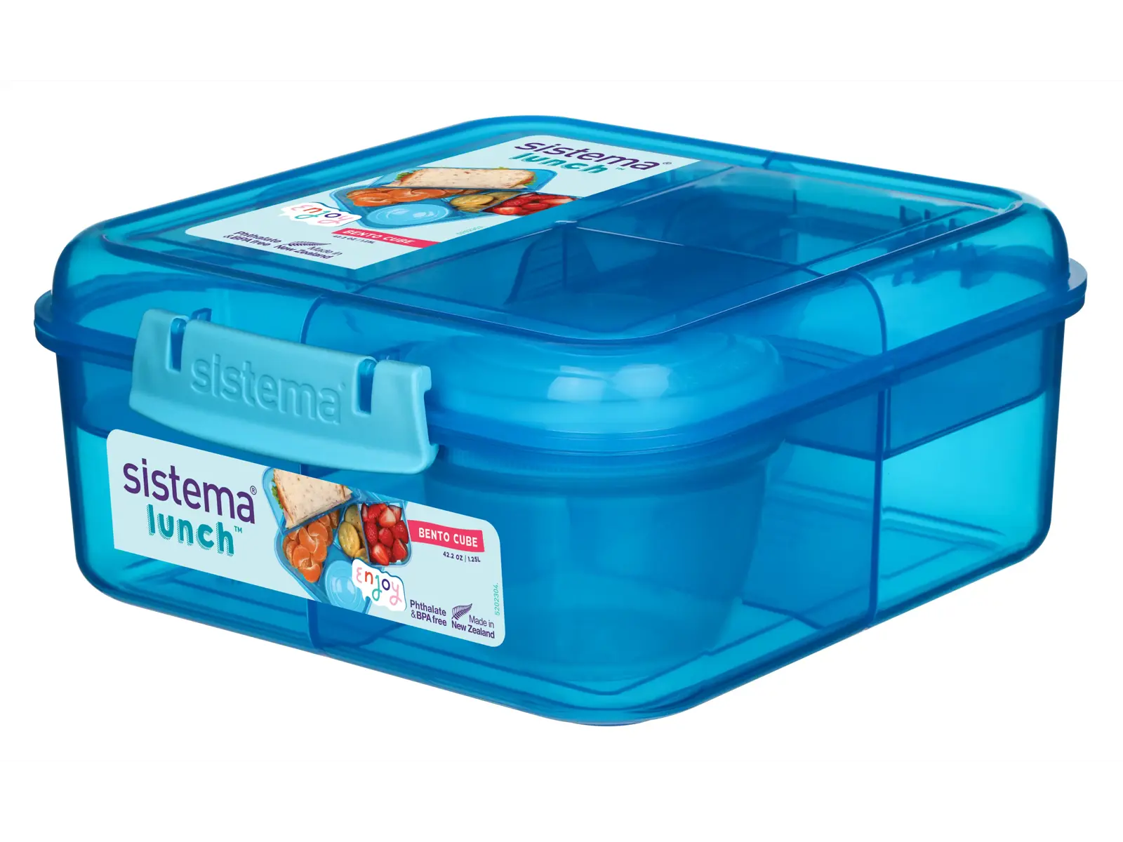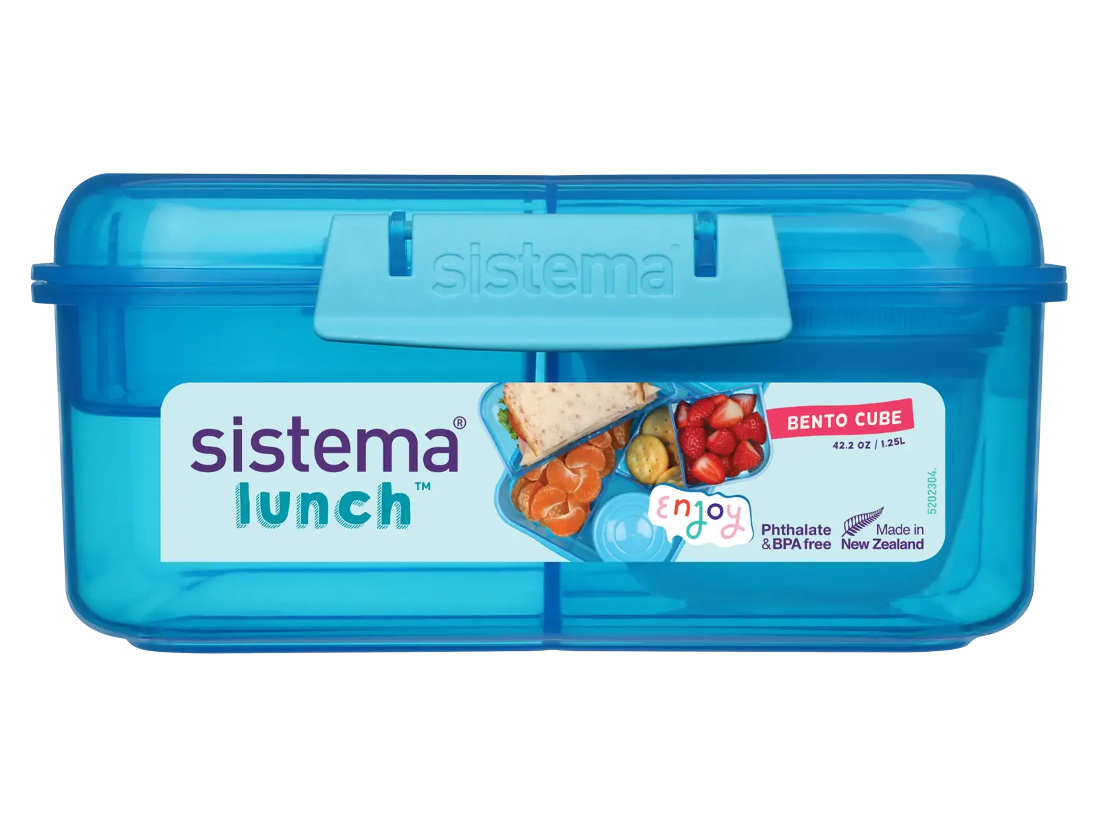 Låget er fastgjort med solide hængsler og lukkes sikkert med Sistema’s ikoniske clips – nemt for små hænder at åbne og lukke. Bento Cube passer perfekt i skoletasken og er lavet i sikre, BPA- og phthalatfrie materialer.