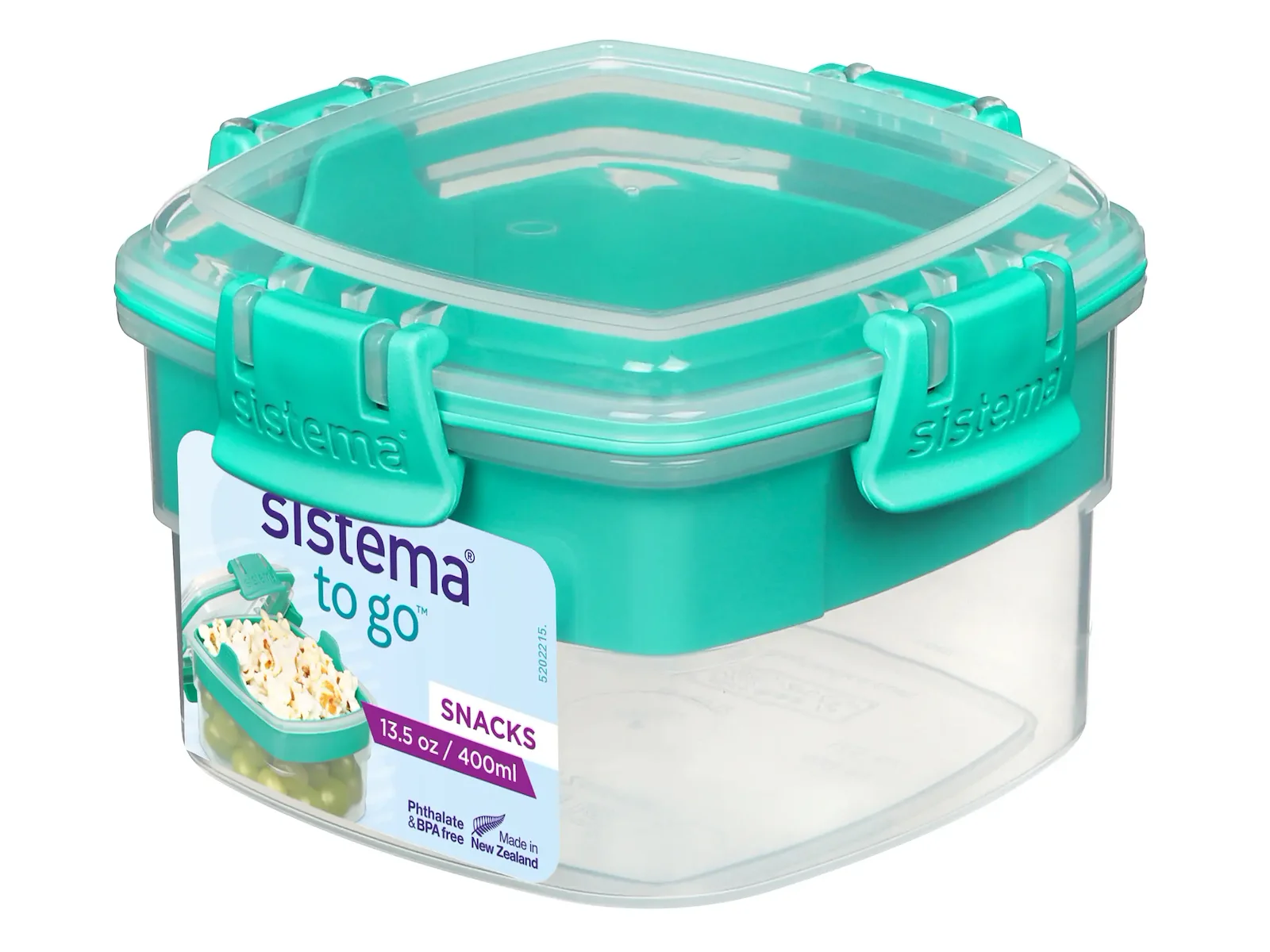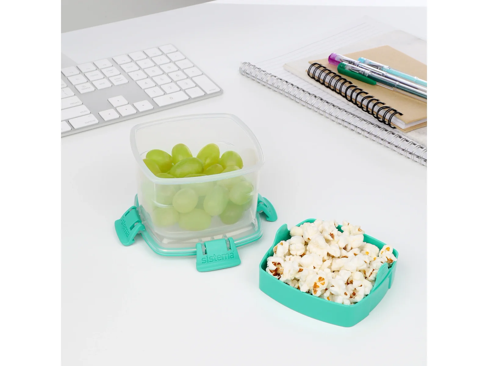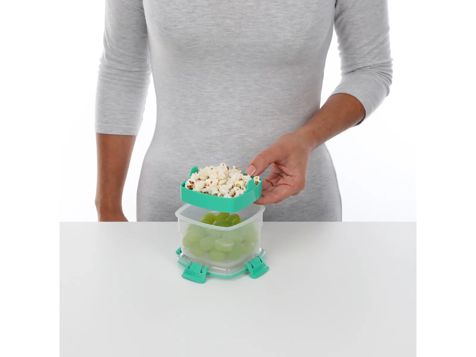 Snackbøtten lukkes med Sistema’s unikke, letlåsende clips, som gør den nem at åbne og lukke – selv for børn. Den er desuden utrolig praktisk, da den tåler opvaskemaskine (øverste hylde), fryser og mikroovn uden låg.