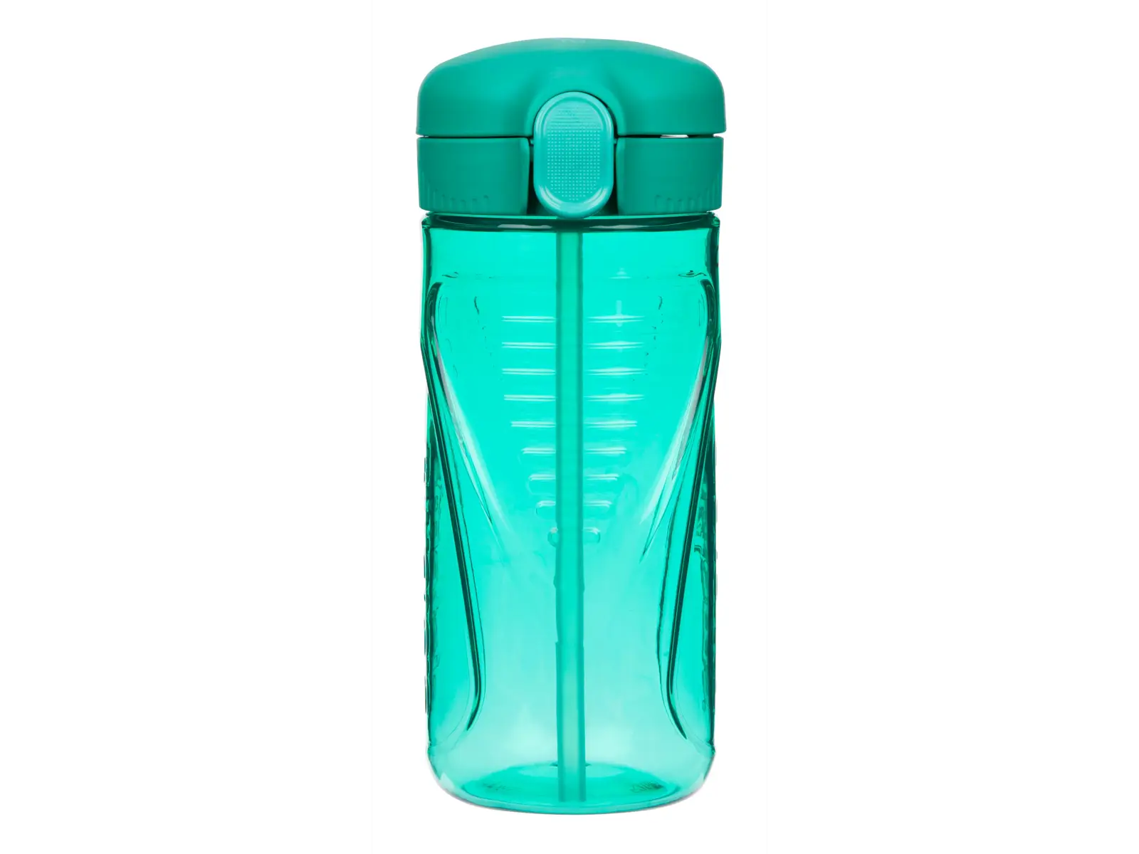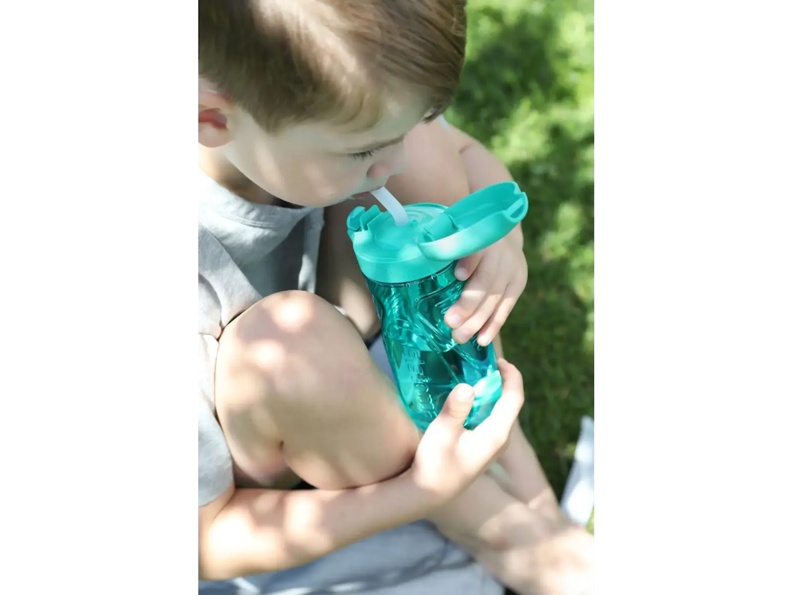 Drikkedunken er udstyret med et smart fliplåg med trykknap. Ét tryk, og det bløde silikonesugerør folder sig ud, så flasken er klar til brug – perfekt til sport, cykelture eller travle skoledage, hvor det skal være nemt at tage en tår.