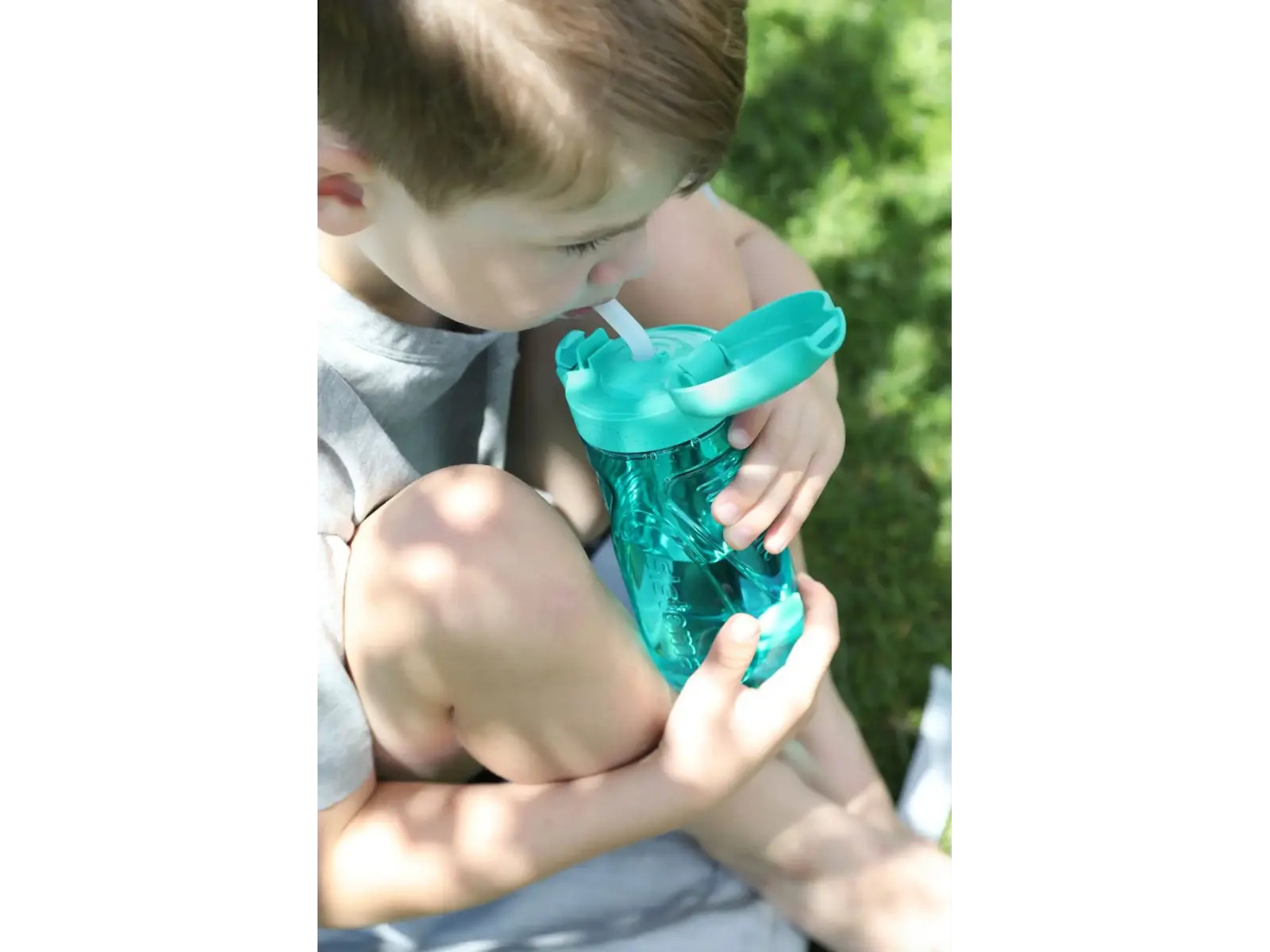 Drikkedunken er udstyret med et smart fliplåg med trykknap. Ét tryk, og det bløde silikonesugerør folder sig ud, så flasken er klar til brug – perfekt til sport, cykelture eller travle skoledage, hvor det skal være nemt at tage en tår.