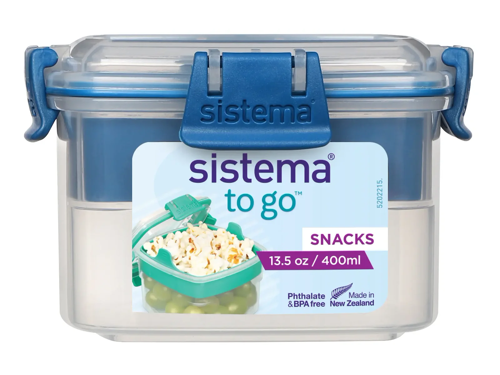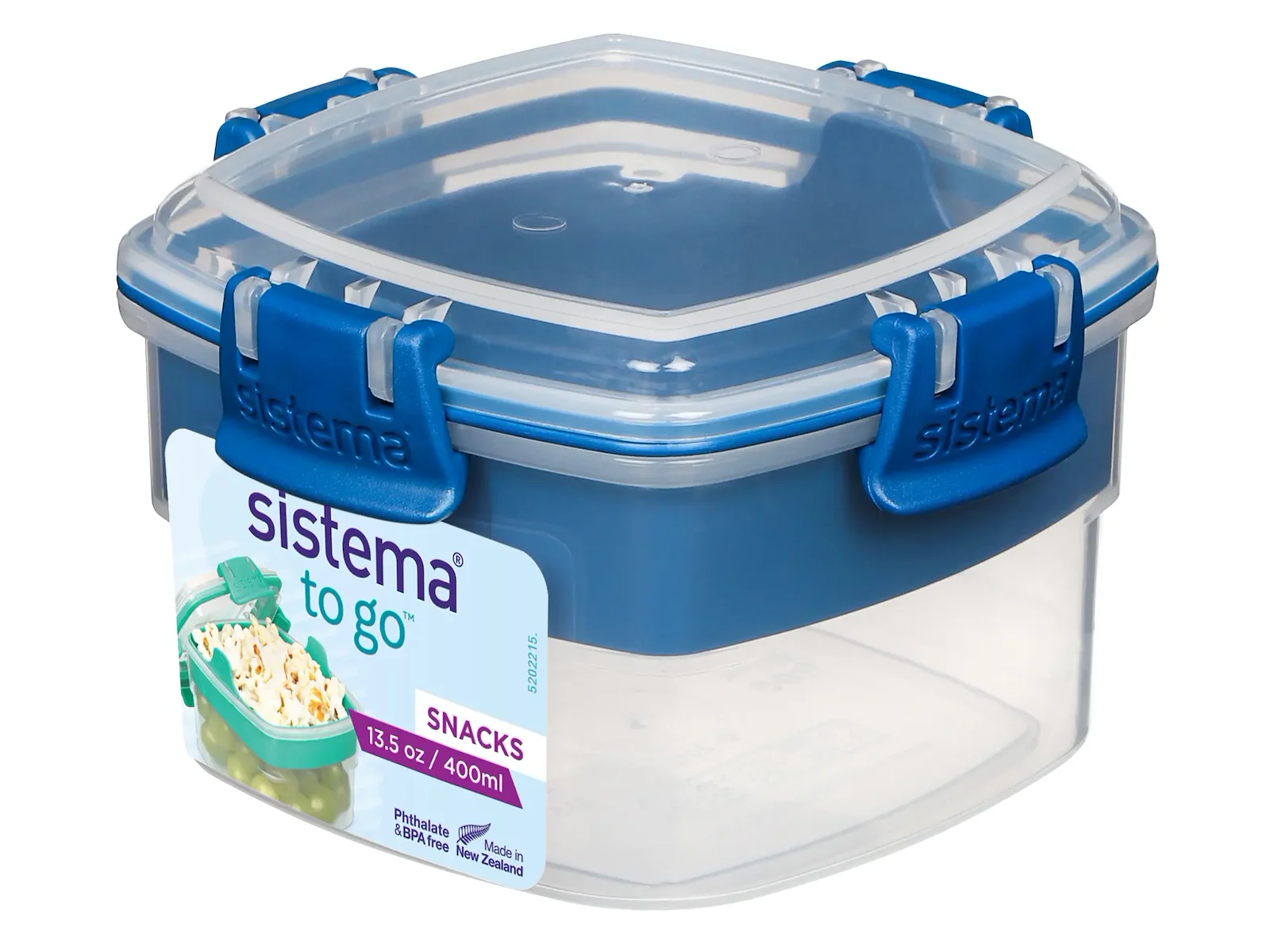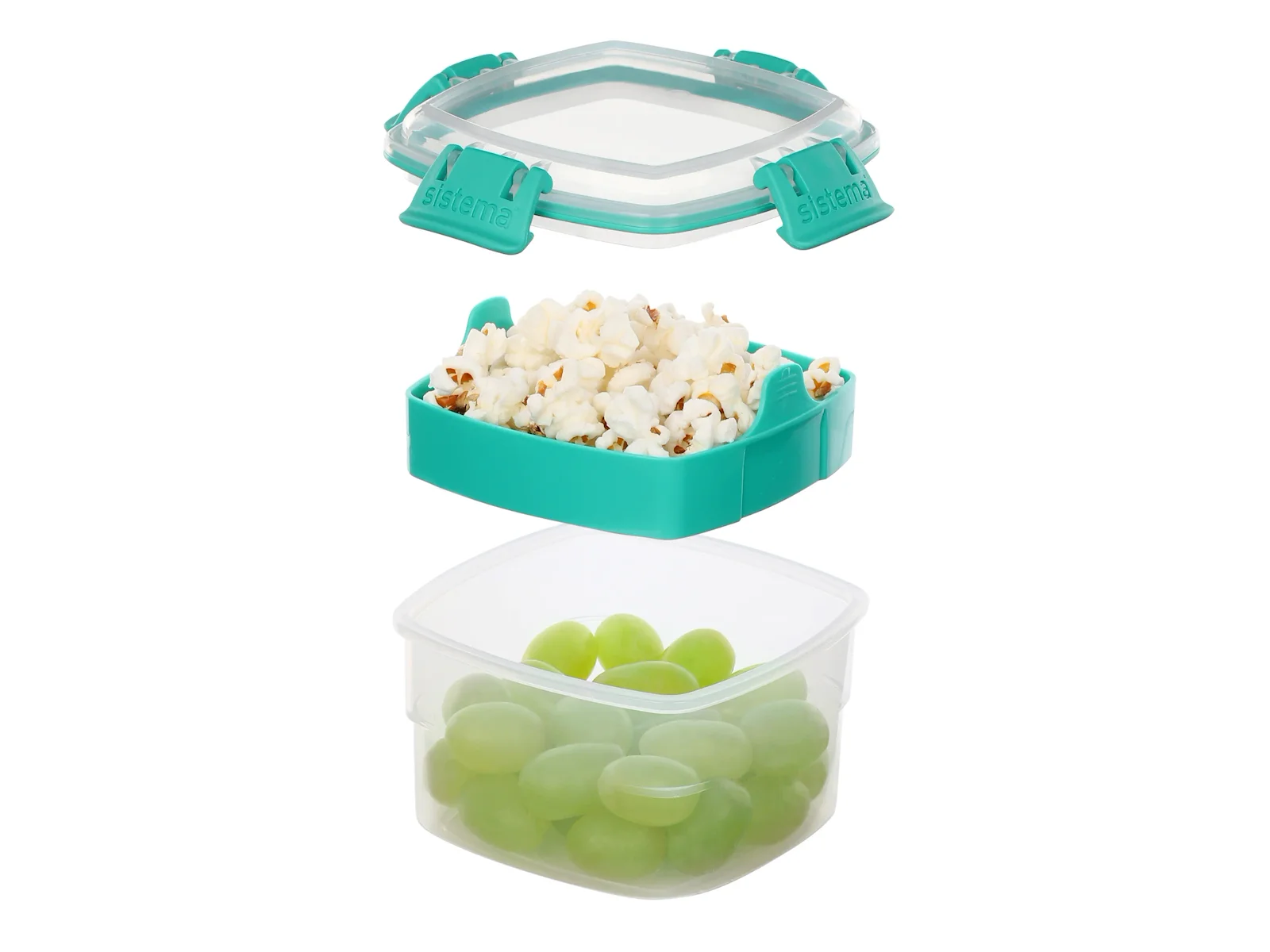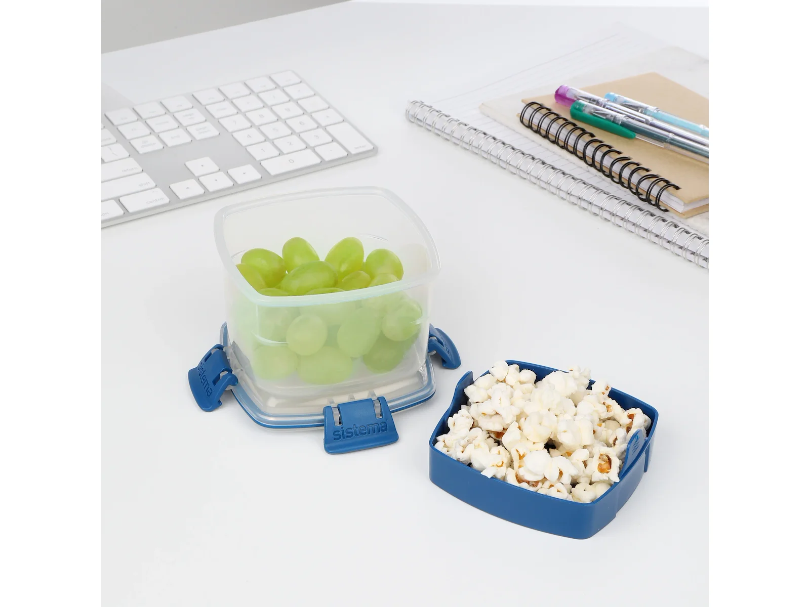 Snackbøtten lukkes med Sistema’s unikke, letlåsende clips, som gør den nem at åbne og lukke – selv for børn. Den er desuden utrolig praktisk, da den tåler opvaskemaskine (øverste hylde), fryser og mikroovn uden låg.