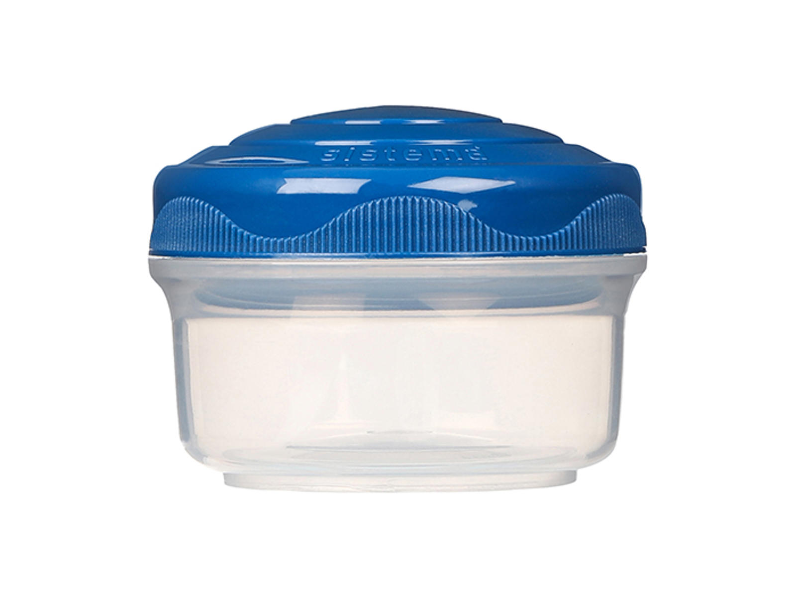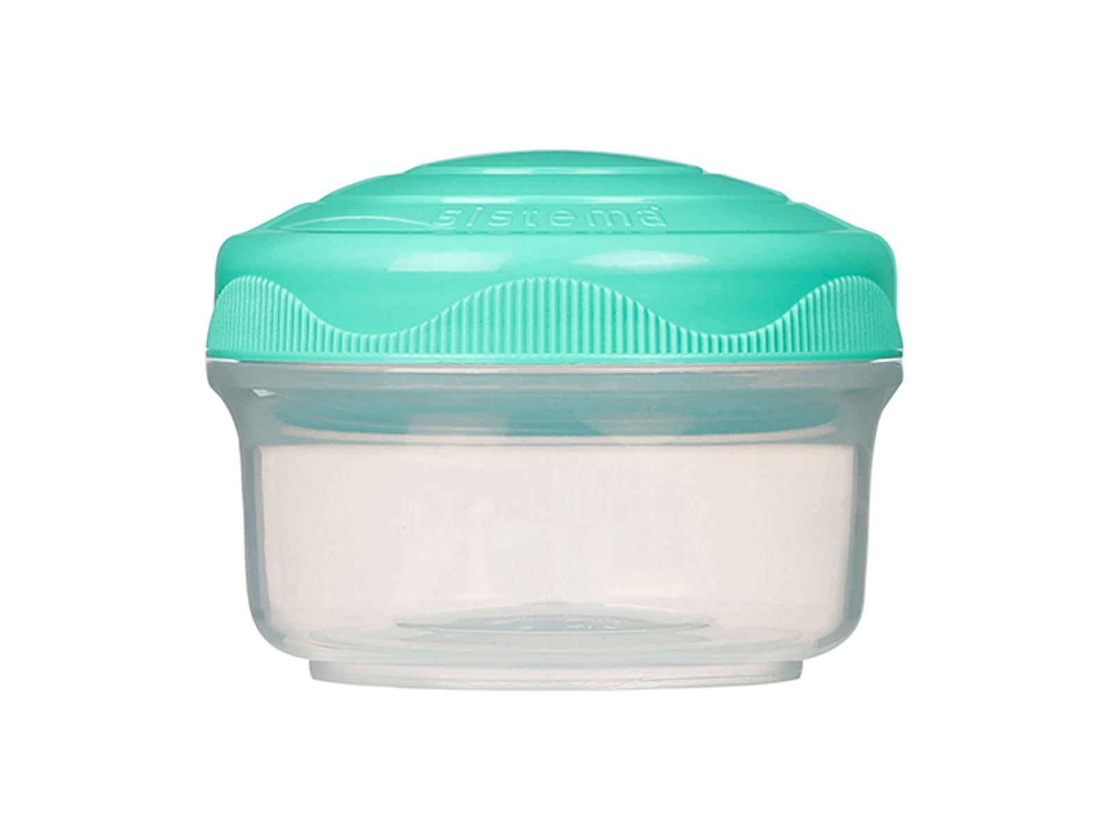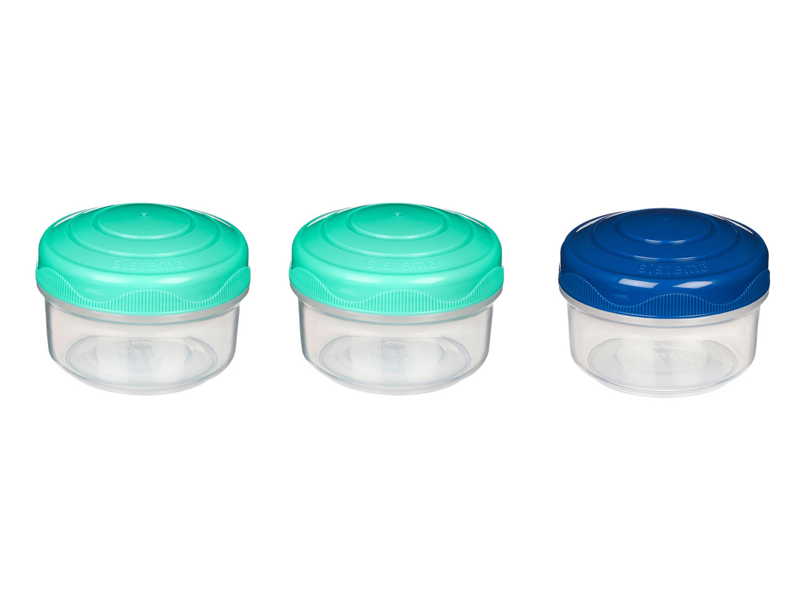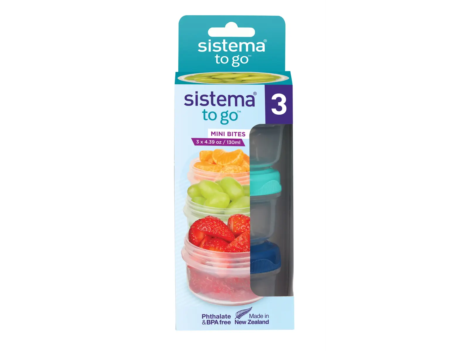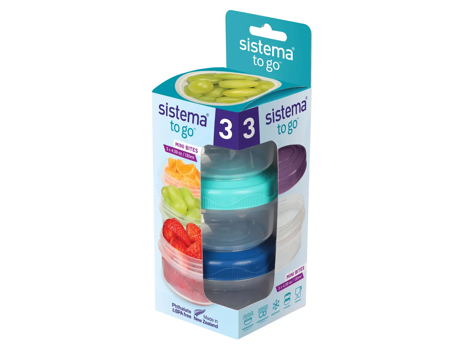 Mini Bites 3-Pack To Go fra Sistema er en praktisk sampak med tre runde bøtter á 130 ml, hver med et tæt skruelåg i smarte farver. De små beholdere er perfekte som tilbehør til madpakken – f.eks. til dressing, rosiner, nødder, skåret frugt eller andre små snacks. Skruelåget holder tæt og er let for selv små hænder at åbne og lukke.