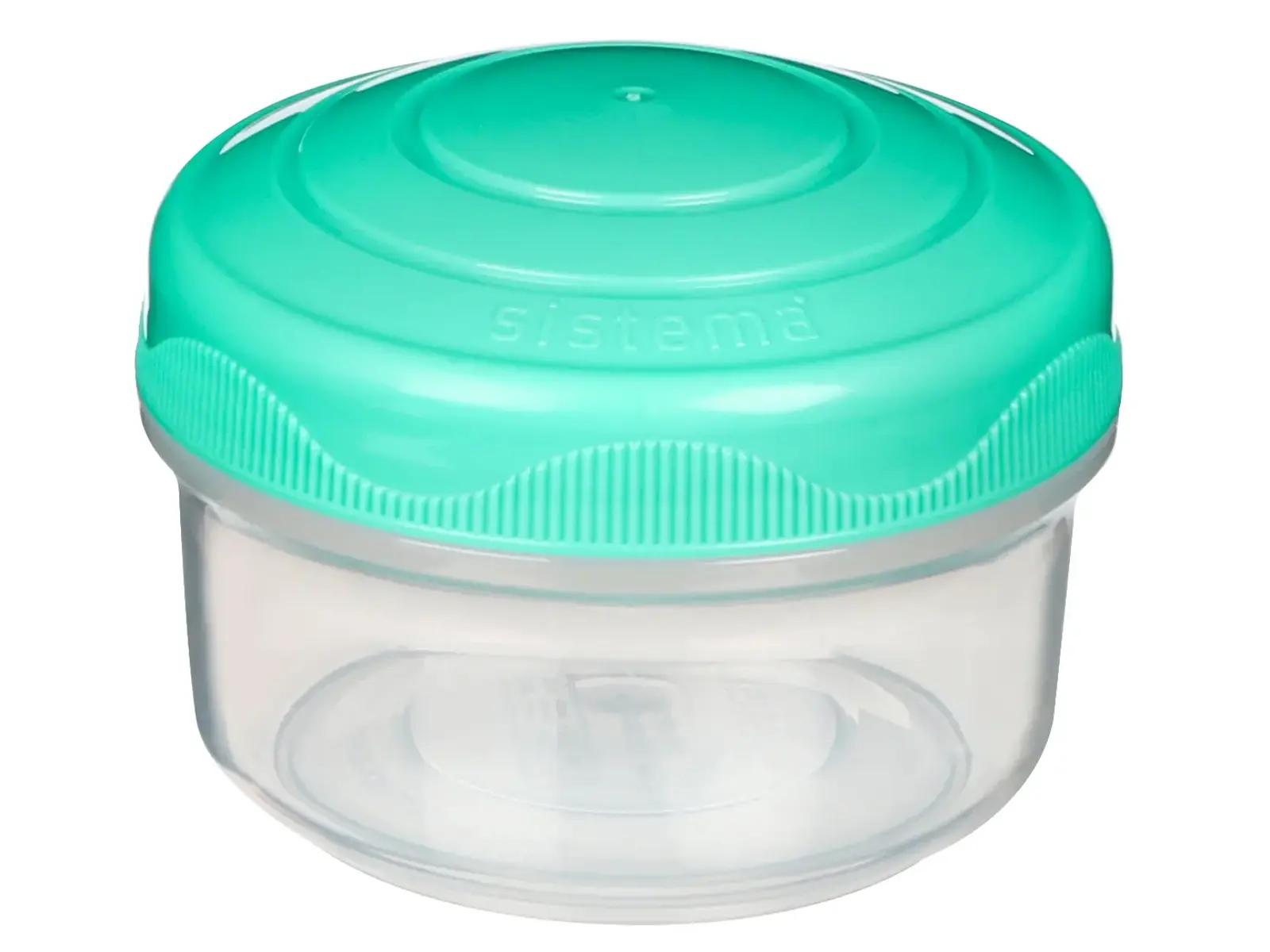 Mini Bites To Go fra Sistema er en lille, praktisk beholder på 130 ml, perfekt til snacks og små portioner på farten. Den kompakte størrelse gør den ideel til frugtstykker, nødder, yoghurt, dip, grøntsagsstænger eller andre små lækkerier, der skal pakkes ned i madpakken eller tasken.