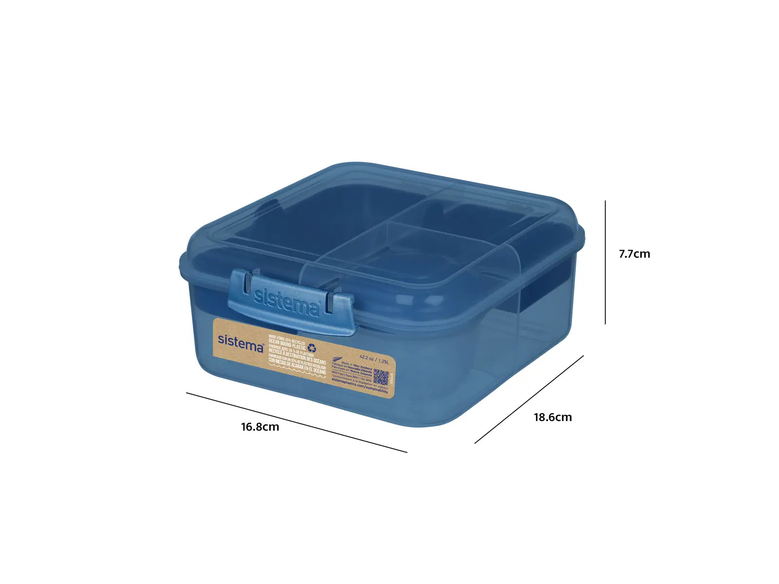 Låget er fastgjort med solide hængsler og lukkes sikkert med Sistema’s ikoniske clips – nemt for små hænder at åbne og lukke. Bento Cube passer perfekt i skoletasken og er lavet i sikre, BPA- og phthalatfrie materialer.