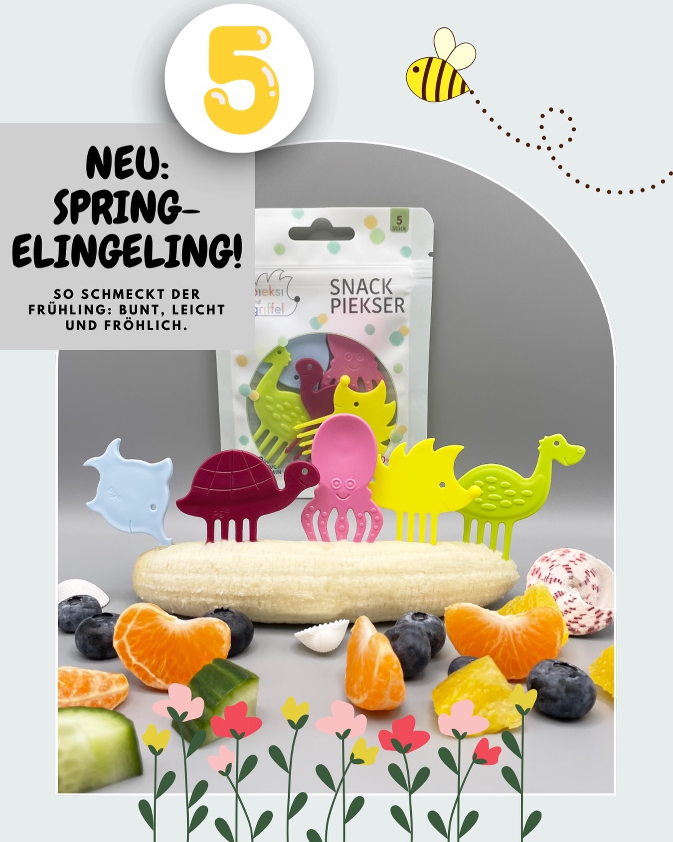 Pieksi und Griffel “Funky Friends” mad gafler i 5-pak er et sjovt og funktionelt tilbehør til børnenes madpakke, som gør det både nemmere og sjovere at spise udskåret frugt, grøntsager og små snacks. De små madspyd hjælper børn med at spise uden at bruge fingrene, så madpakken holder sig ren og overskuelig, både i børnehave og skole. De fantasifulde figurer i sættet skaber glæde og pirrer barnets nysgerrighed, så snack tid bliver til en positiv og engagerende oplevelse.