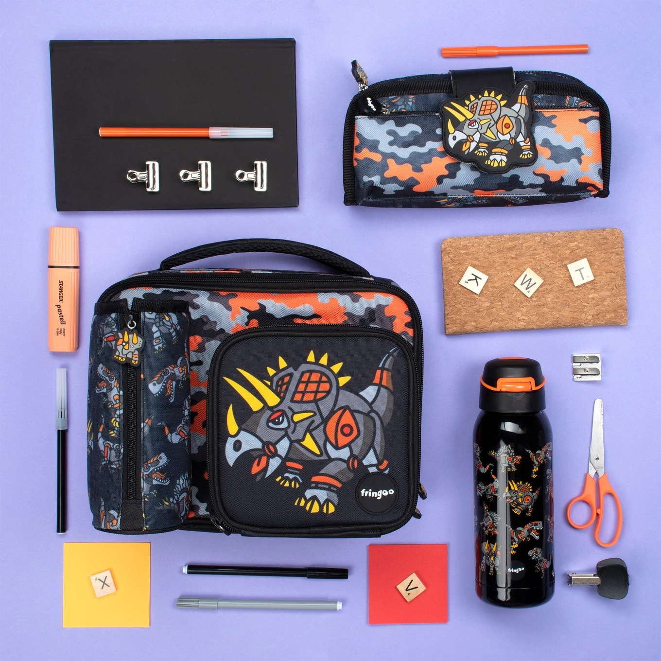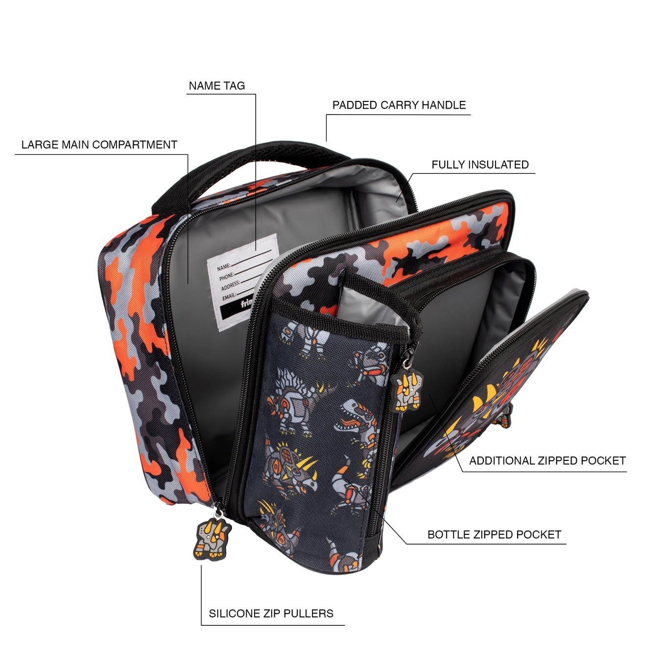 Fringoo køletaske med Dinosaur Robot-design er den perfekte følgesvend til skole, udflugter eller fritid. Tasken kombinerer funktionalitet med et sjovt og farverigt design, der appellerer til børn.