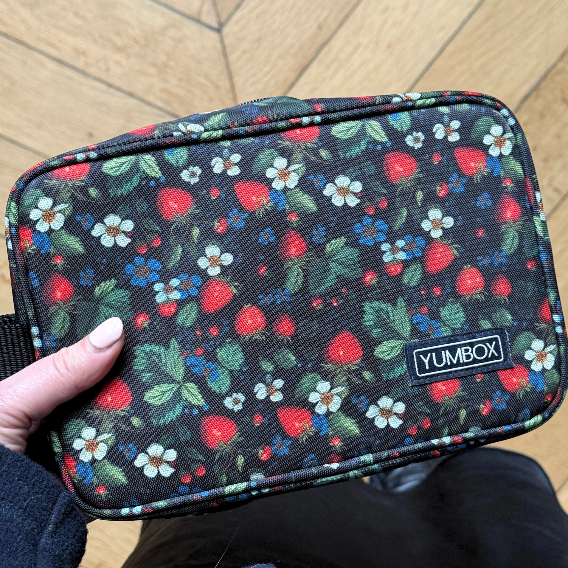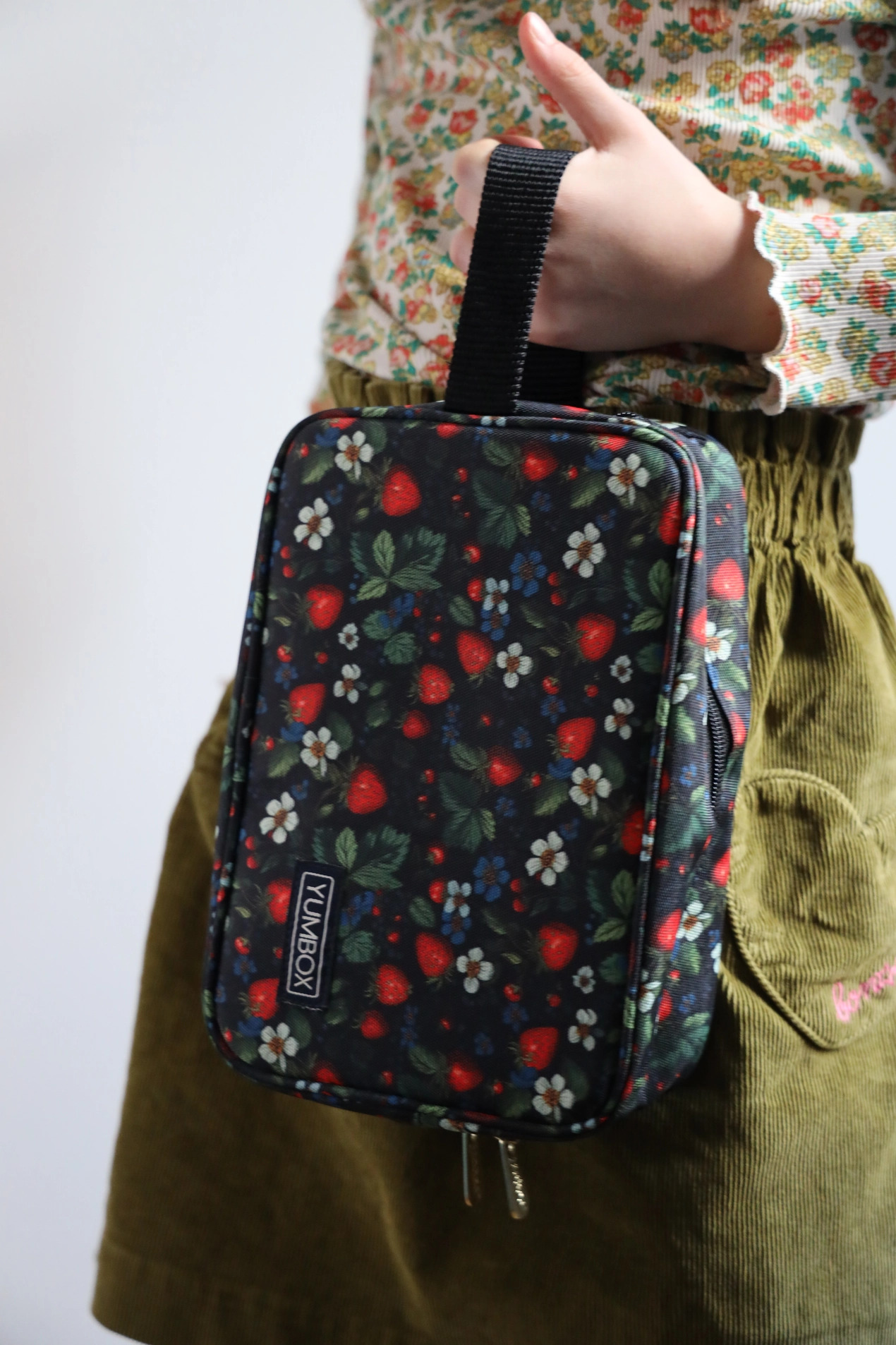 Gør det nemt at holde madpakken frisk hele dagen med denne Yumbox køletaske i det fine jordbær print. Tasken er isoleret og leveres med 2 medfølgende køleelementer, så du får en komplet løsning til både skole, børnehave og udflugter.