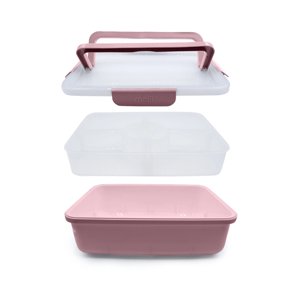 Med aftagelige skillevægge kan du nemt tilpasse rummene til frugt, snacks, ost, kiks og meget mere. Det praktiske nederste rum er perfekt til servietter, bestik, tallerkener eller ispakker ❄️🍴 – alt samlet ét sted!