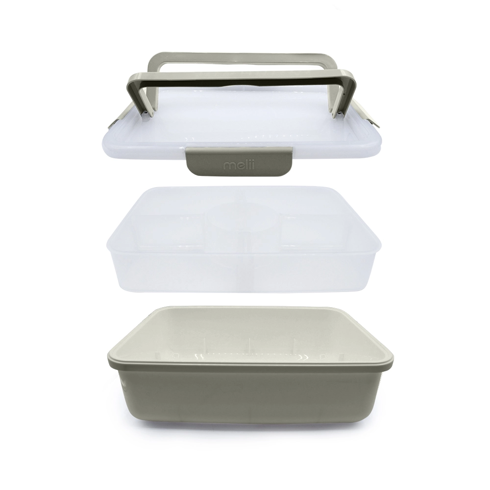 Med aftagelige skillevægge kan du nemt tilpasse rummene til frugt, snacks, ost, kiks og meget mere. Det praktiske nederste rum er perfekt til servietter, bestik, tallerkener eller ispakker ❄️🍴 – alt samlet ét sted!