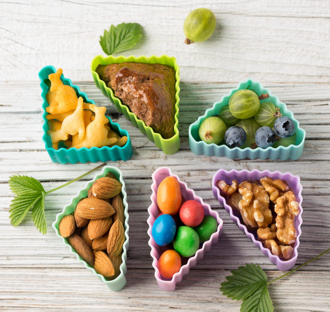De trekantede cups udnytter pladsen i madkassen og har en fin størrelse til f.eks. nødder, kerner, små kiks, bær og andre godbidder.