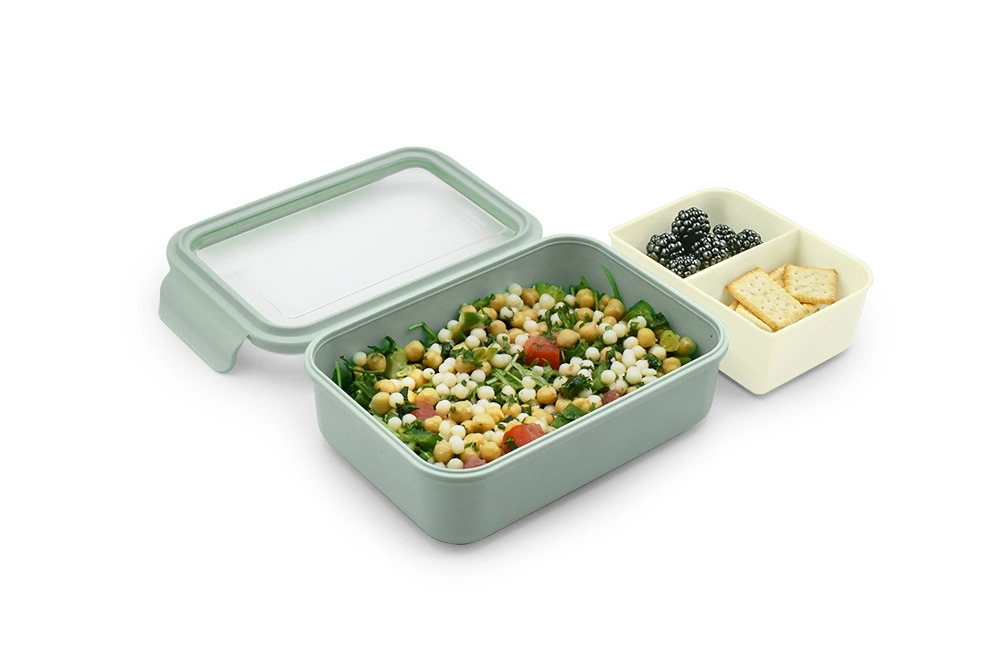 Madkassen har en gennemtænkt ruminddeling, så maden holdes adskilt og frisk hele dagen. Den indeholder to større rum samt to mindre, aftagelige beholdere på ca. 260 ml hver. De små beholdere kan bruges til frugt, grønt, snacks eller dip – og kan tages ud, hvis du har brug for mere plads til større madvarer som sandwich eller pastasalat.